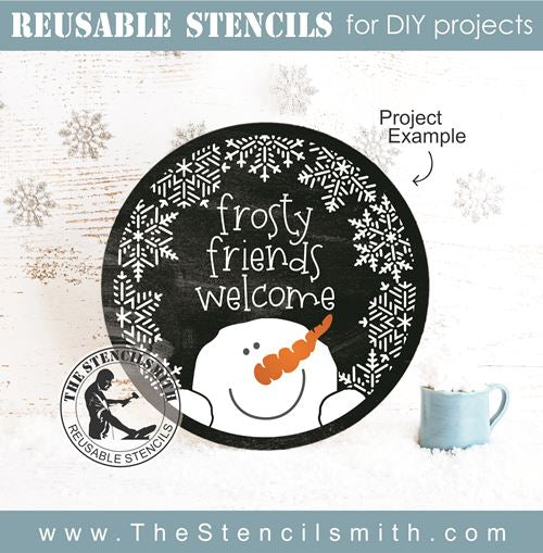 Create charming winter décor with our Frosty Friends Welcome Stencil. Featuring a snowman peeking from inside a snow globe or frosty window, perfect for crafting festive welcome signs.