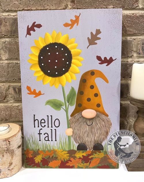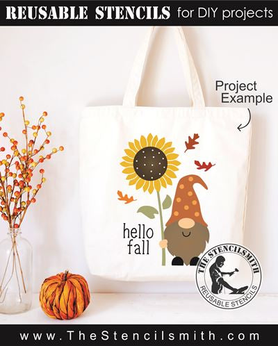 This cheerful stencil of a sunflower gnome is the perfect way to DIY your way into fall decor! Get crafty (and cute) with the hello fall sunflower gnome stencil and paint adorable signs, bags and more!