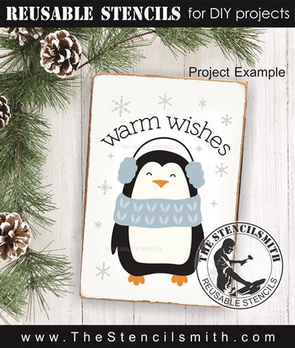 Enhance your winter decor with the Warm Wishes penguin stencil. Create your own winter wonderland DIY signs and decor with this chilly penguin wrapped in his scarf and earmuffs.